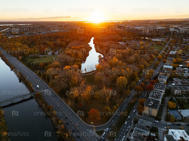 Вид с воздуха на Монреальский парк Ангриньона и городской лес при закате солнца возле городского пейзажа