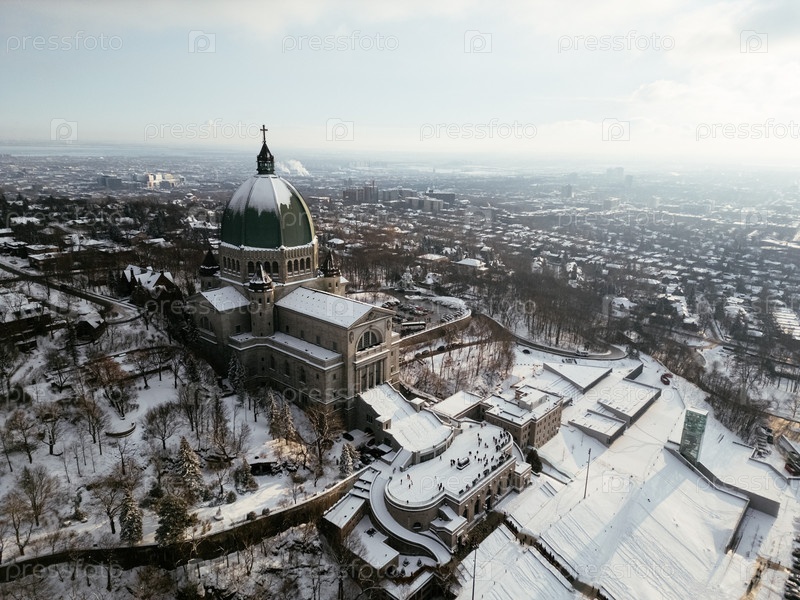 Вид с воздуха Оратория Святого Иосифа на горе Королевской во время захода солнца зимой.Монреаль, Квебек, Канада