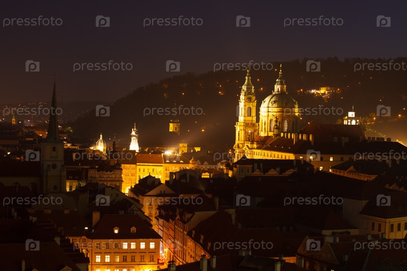 Ночной вид на церковь Святого Николая в старом городе Праги с освещенным барокковым куполом и историческими крышами