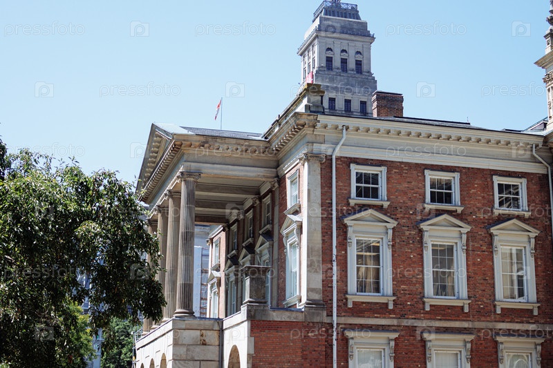 Исторический зал суда с классической архитектурой окружен деревьями в центре Торонто, Канада