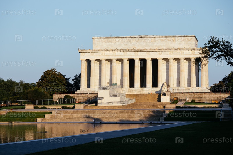 Мемориал Линкольна на рассвете, отражающийся в воде, является историческим памятником в Вашингтоне