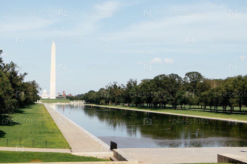 Памятник Вашингтону отражен в бассейне Мемориала Линкольна на Национальной торговой площадке, округ Колумбия