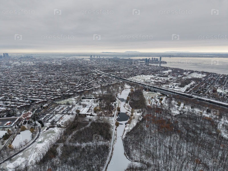 Зимний вид из воздуха на пригороды Монреаля, снежный парк Ангриньон и реку возле Лачина и Вердена под облачным небом