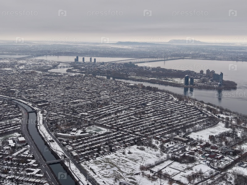Зимний вид из воздуха на пригороды Монреаля, снежный парк Ангриньон и реку возле Лачина и Вердена под облачным небом