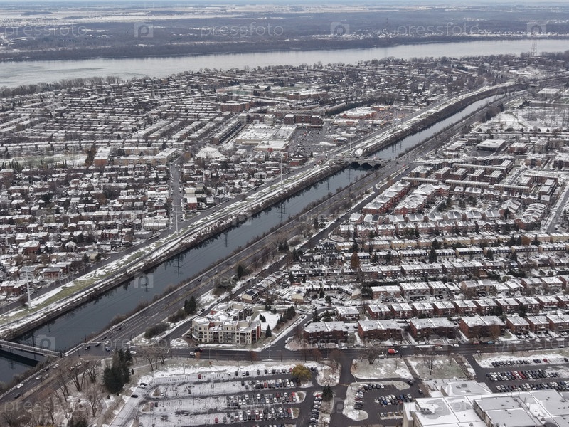 Зимний вид из воздуха на пригороды Монреаля, снежный парк Ангриньон и реку возле Лачина и Вердена под облачным небом