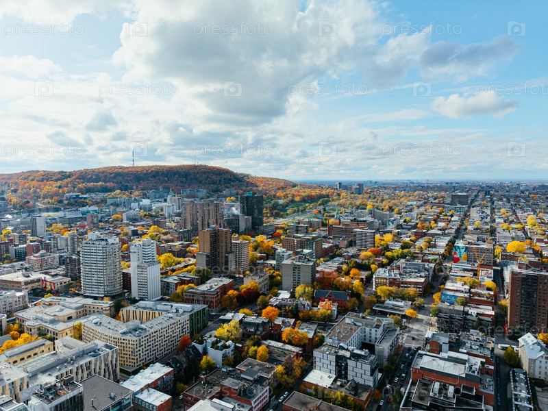 Осенний воздушный вид горизонта Монреаля с многоэтажными зданиями под облачным небом