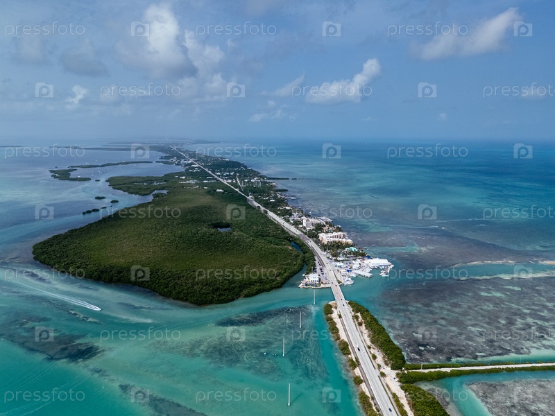 Вид с воздуха на бирюзовый океан, остров мангровых деревьев и зарубежную автомагистраль в Флорида Кейс с лодками и чистой водой