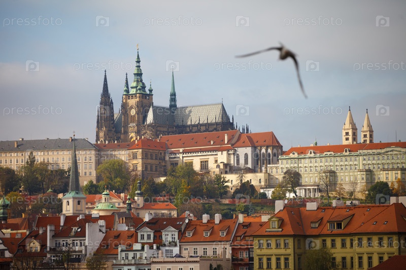 Пражский замок с красными крышами и летающей птицей над историческим центром города, Чехия