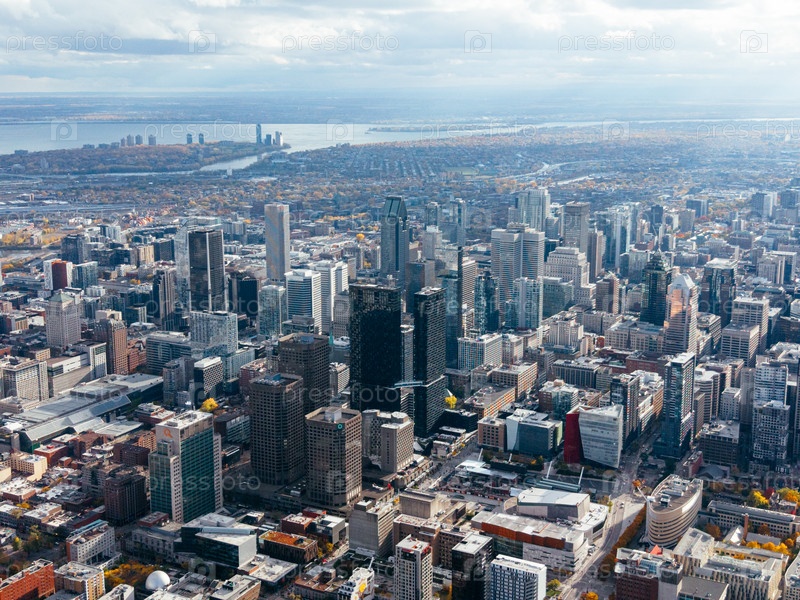 Осенний воздушный вид горизонта Монреаля с многоэтажными зданиями под облачным небом