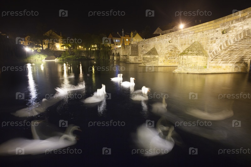 Длинный ночной вид каменного моста Писек с лебедями на реке Отава, Чехия