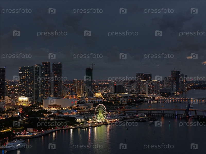 Горизонт центра Майами на закате с освещенным колесом обозрения и береговой линии Марина, Флорида, США