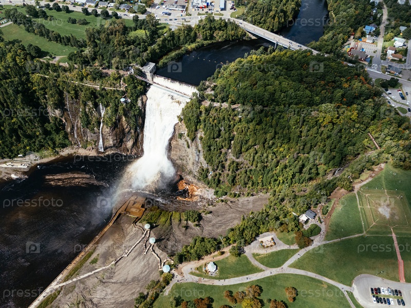 Вид с воздуха на водопад Монморенси-Фоллс возле Квебека с драматическими скалами, лесом и текущей рекой