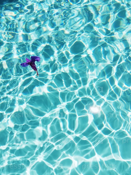 Фиолетовый цветок плавает на чистой бирюзовой воде бассейна с яркими солнечными отражениями