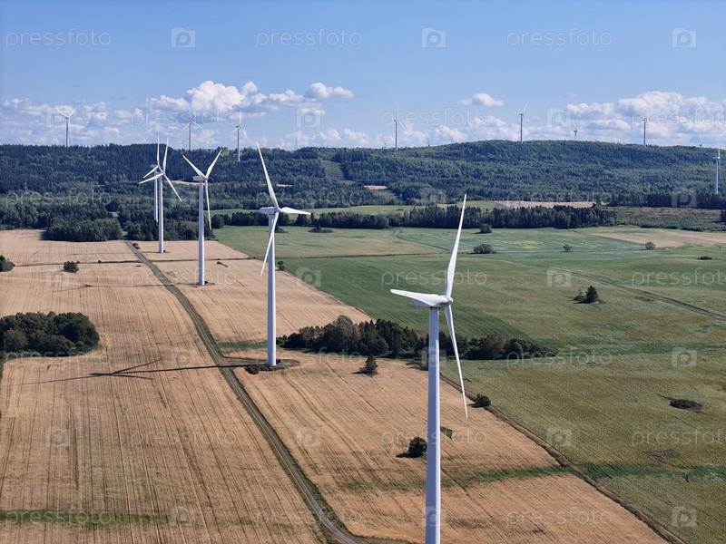 Белая ветряная электростанция на сельскохозяйственных угодьях под голубым небом, взгляд с воздуха на ветровые турбины в деревне