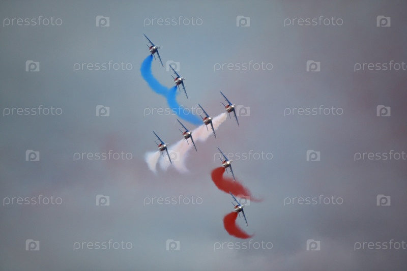 16.06.2025 Французские самолеты в плотной формации оставляют следы красного и синего дыма во время авиашоу. g