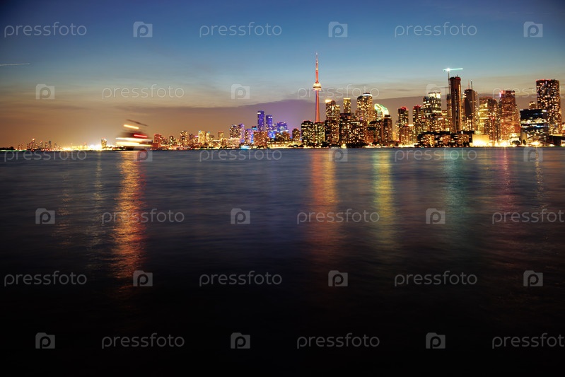 Горизонт Торонто на закате с освещенными городскими огнями, отражающими воду, ярким ночным видом на город