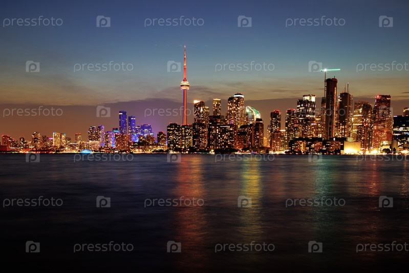 Горизонт Торонто на закате с освещенными городскими огнями, отражающими воду, ярким ночным видом на город
