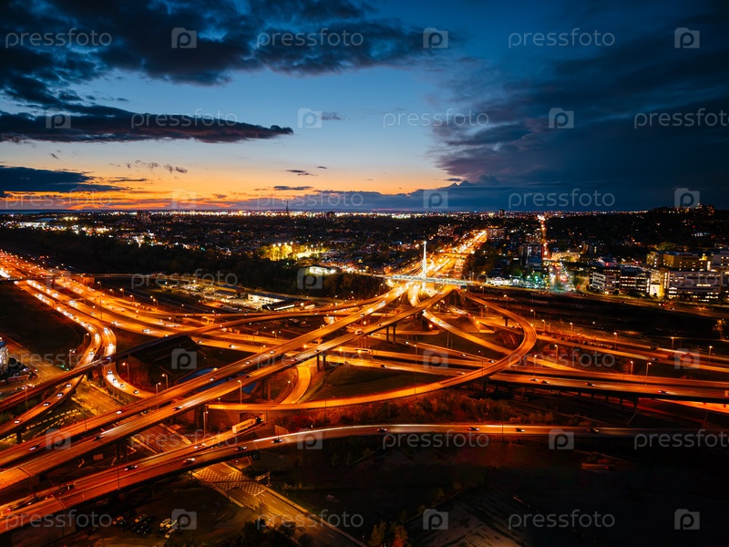 Ночной вид с воздуха на перекресток Турко в Монреале со светящимися шоссе и городскими огнями во время драматического синего часа
