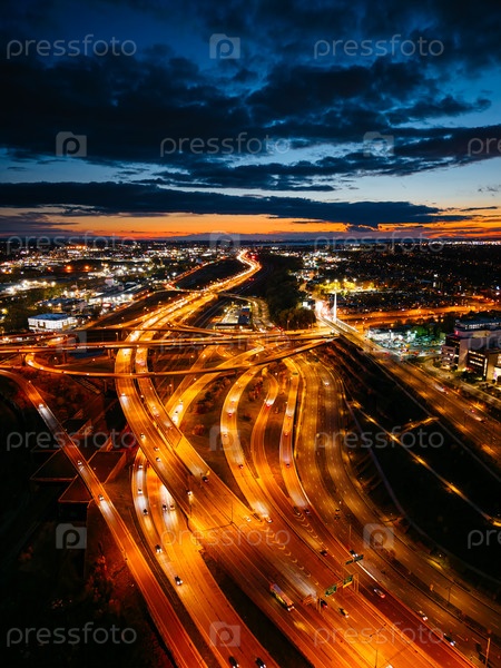 Ночной вид с воздуха на перекресток Турко в Монреале со светящимися шоссе и городскими огнями во время драматического синего часа