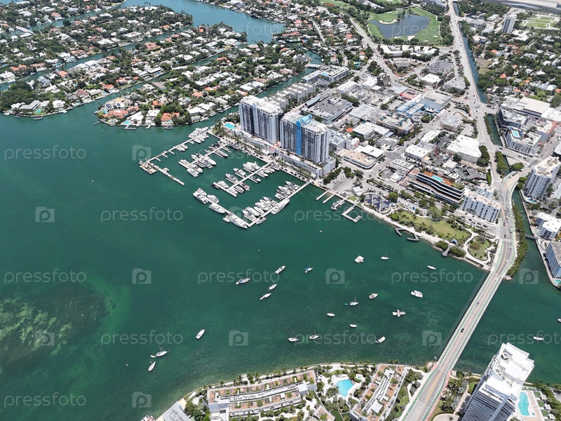 Вид с воздуха на горизонт Майами и островные набережные над бирюзовым заливом Бискейн в солнечной Флориде, США