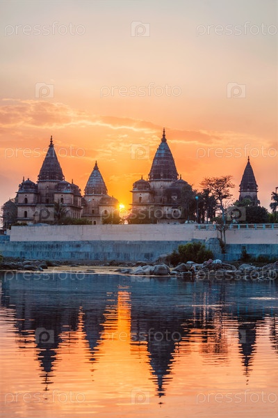 Вид на королевский кенотаф Орчи над рекой Бетва.Орха, штат Мадхья-Прадеш, Индия.С вспышкой линзы и утечкой света
