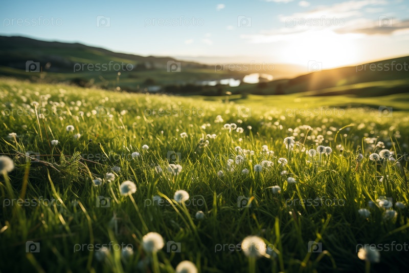 Поле луга с цветами на закате