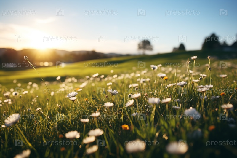Идиллический сельский пейзаж травянистого лугового поля с ромашковыми цветами на закате