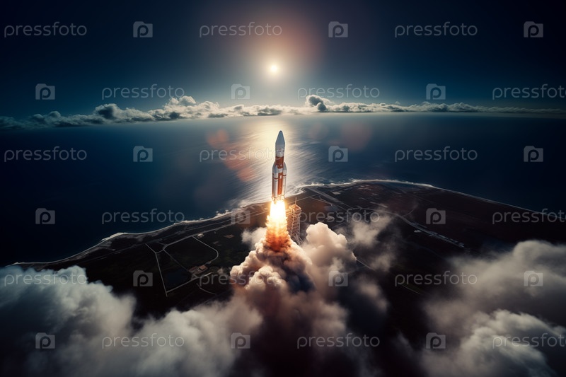 Вид с воздуха запуска ракеты на рассвете над побережьем океана.Ракета взлетает со следом дыма и пламени позади себя