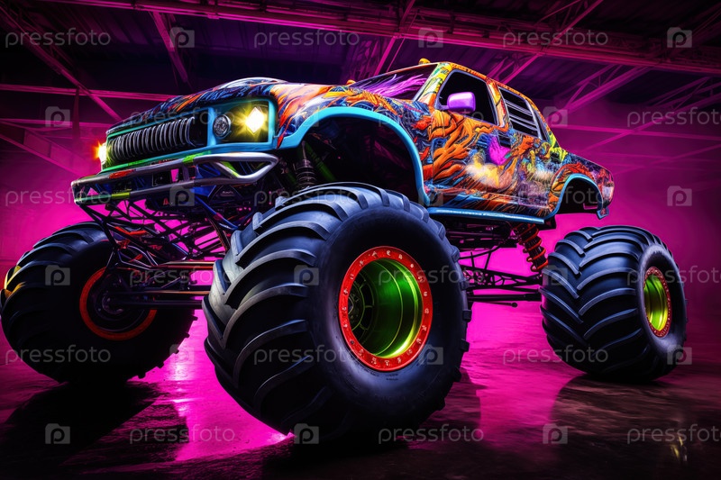 Грузовик-монстр, освещенный неоновыми огнями - волнение и острые ощущения экстремальных видов спорта и развлечений - гоночное шоу