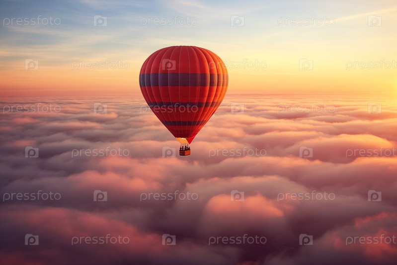 Красочный воздушный шар парит над морем облаков при закате солнца с оранжевым и голубым небом на заднем плане