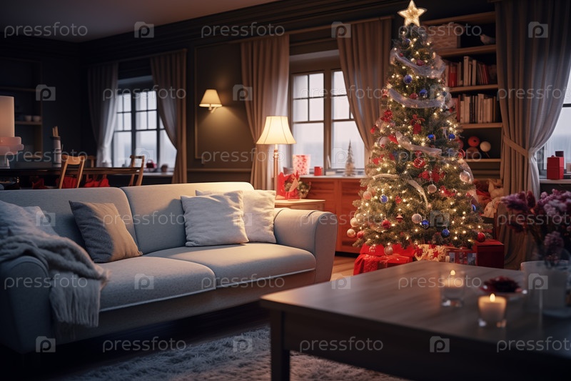 Уютная внутренняя гостиная, украшенная рождественской елкой.Изображение отражает теплую и гостеприимную атмосферу праздничного сезона