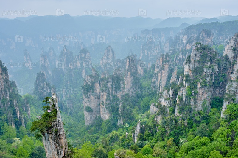 Известная туристическая достопримечательность Китая - каменные столбы скальных гор Чжанцзянджи в туманных облаках во Вулингюане, провинция Хунань, Китай