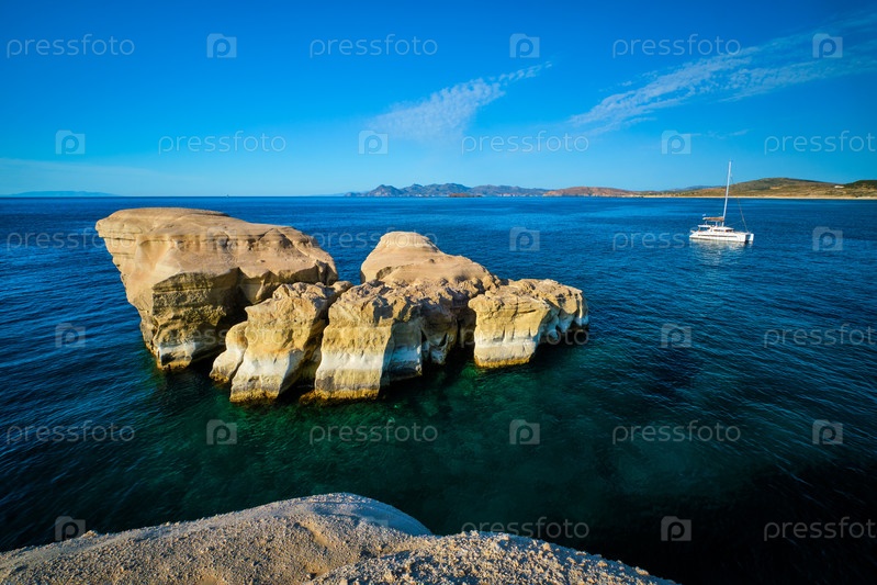 Яхта на пляже Саранико в Эгейском море, остров Милос, Греция