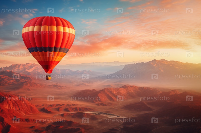 Красочный воздушный шар парит в небе над пустынным горным пейзажем при закате солнца с оранжевым и голубым небом на заднем плане