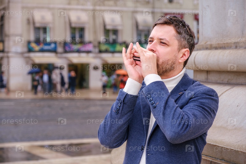 Музыкант-мужчина в синем блейзере и белом свитере играет блюз на гармонике со закрытыми глазами, стоя на городской улице