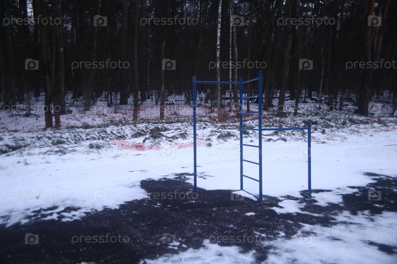 Ландшафт с зимним лесом, растениями и спортивным баром