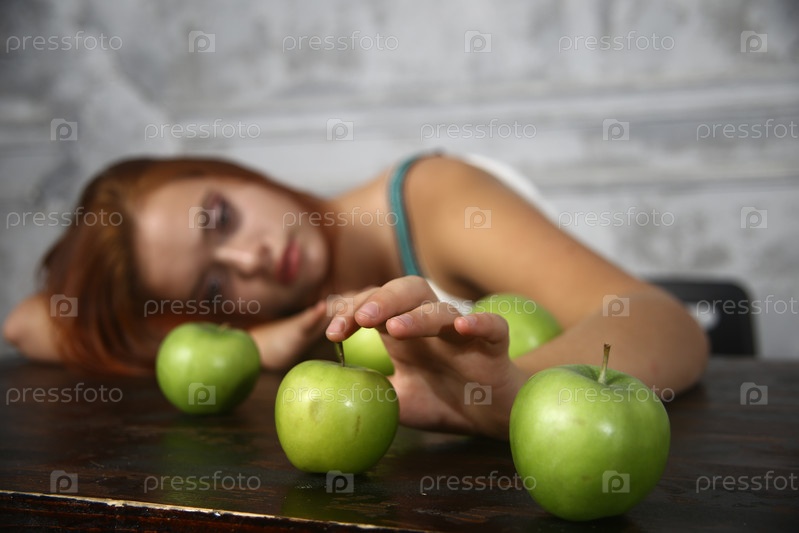 Красивая девушка с зелеными яблоками сидит за столом