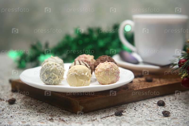 Шоколадные конфеты на доске, чашка кофе и новогодние украшения