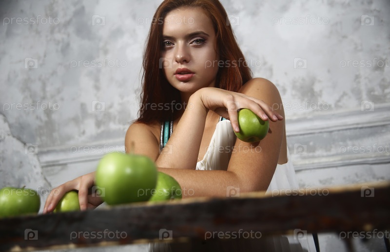 Красивая девушка с зелеными яблоками сидит за столом