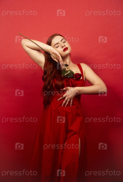 Красивая девушка в красном платье с розой