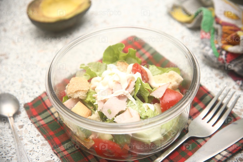 Салат с овощами и мясом в миске