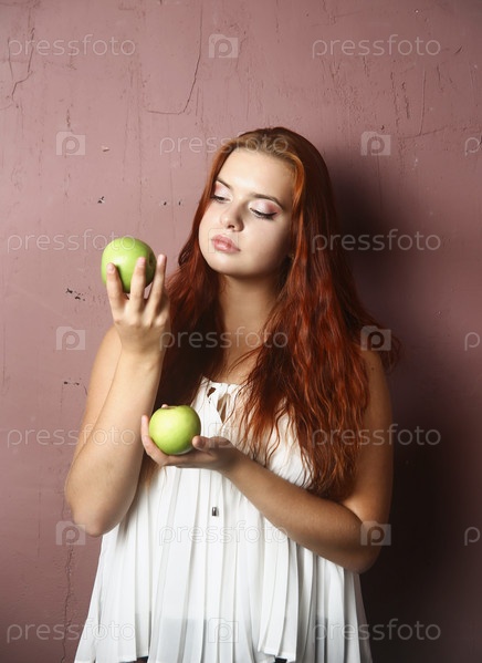 Красивая девушка с зелеными яблоками в руках