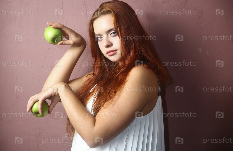 Красивая девушка с зелеными яблоками в руках на красном фоне