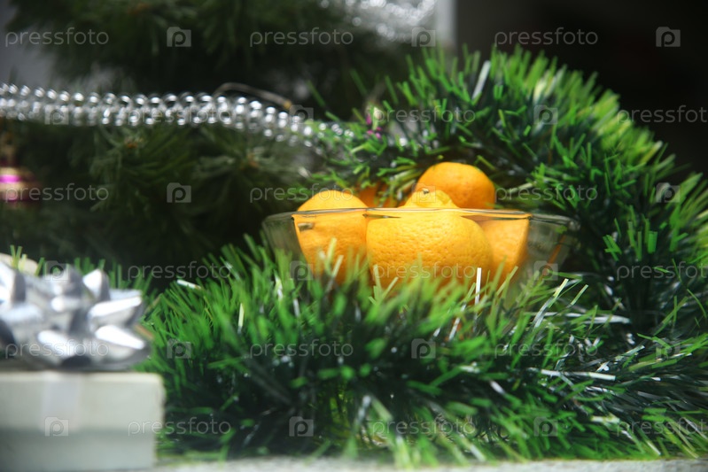 Мандаринки в вазе с тинцелем и рождественской елкой на столе