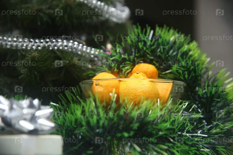 Мандаринки в вазе с тинцелем и рождественской елкой на столе