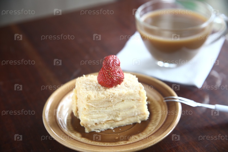 Кусок торта Наполеон со клубникой в тарелке