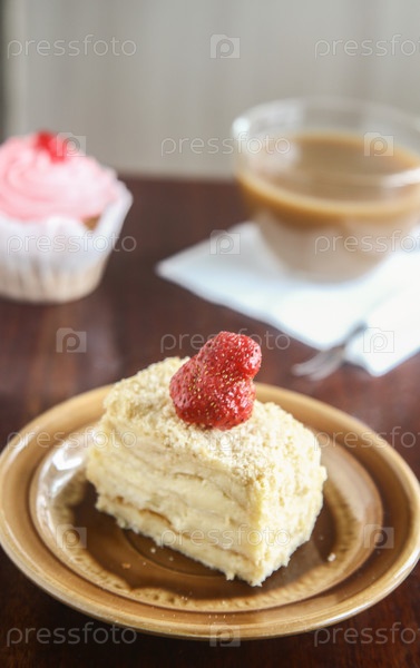 Вкусный торт Наполеон с сливками и клубникой на столе