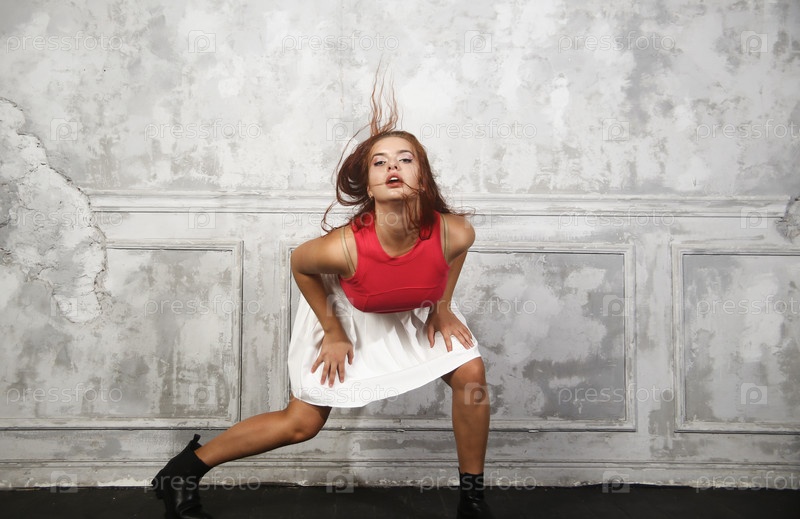 Красивая девушка позирует во время прыжка