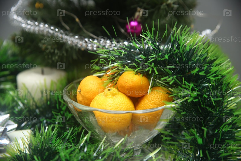 Мандаринки в вазе с тинцелем и рождественской елкой на столе
