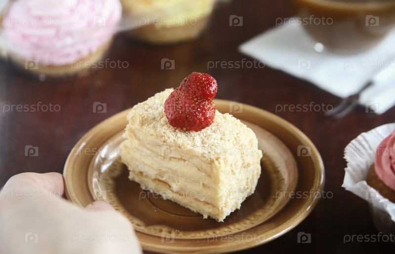 Кусок торта Наполеон со клубникой в тарелке